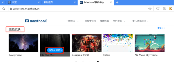 在傲游浏览器主题背景设置中,不难发现能选择的背景皮肤比较少,不过用户可以自己扩展添加。点击页面上方的扩展程序图标,在弹出的选项中点击“获取更多”按钮。跳转到插件中心后,下滑找到主题皮肤一览,选中对应的皮肤图片后,点击“添加至傲游6”就能应用了。