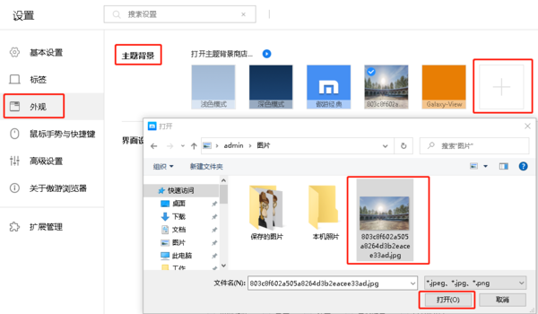 如果不想添加使用系统提供的背景图片,用户也可以自己下载图片使用。同样是在主题背景设置中,点击右侧的加号键,在弹出的选项框中,找到想要使用的图片,选中后点击“打开”键就行了。