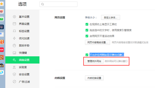 第四步,这样勾选之后,就可以阻止所有的网页弹出式广告了。但是,也会有一些网站例外,这时候我们就需要可以点击下面的【管理例外网站】按钮进行设置。