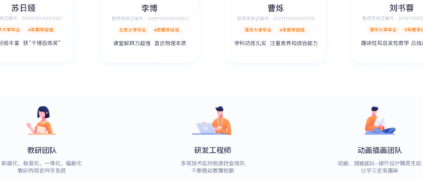 拿一位家长的话讲就是“毕竟能在猿辅导中教课的老师,也不是吃素的”,确实如此,猿辅导的师资团队是非常厉害的,其中的老师可以说是“名校毕业、教育经历多、知识面广”,而且猿辅导还对教师进行定期培训,让他们的教育质量稳步提升;另外,这个专业团队不只是师资,还指研发工程师和动画插画等,他们的存在可以让教育更加创新,也可以让课程变得生动活泼。