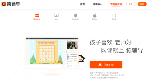 我们通过浏览器搜索到猿辅导的官网,可以看到其官方旗下有许多产品,我们需要找到猿辅导,然后在页面上方找到“下载客户端”。之后就会跳转至下载界面;如果是Windows用户,就选择Windows下载,如果是Mac用户,就选择Mac下载。在官网上下载猿辅导,可以保证软件的原装正版,从而避免其他软件的干扰。