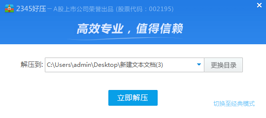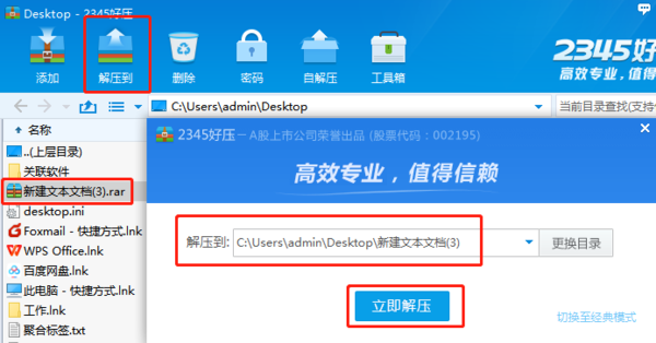 找到并打开2345好压客户端之后,首先需要找到对应的压缩包,建议解压之前将压缩包保存在电脑桌面上,这样找起来比较方便。找到并选中压缩包之后,点击页面上方的“解压到”图标。之后,同样需要选择解压文件保存的位置,再点击“立即解压”。