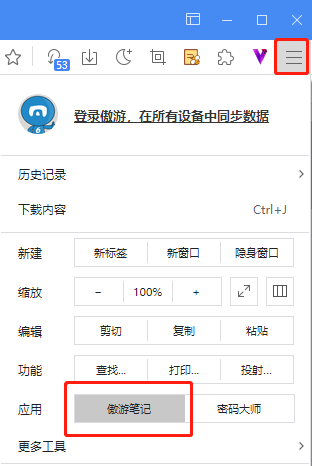 方式三:点击浏览器右上角的三根横线图标,在弹出的选项窗口中,选择应用一栏的“傲游笔记”键。