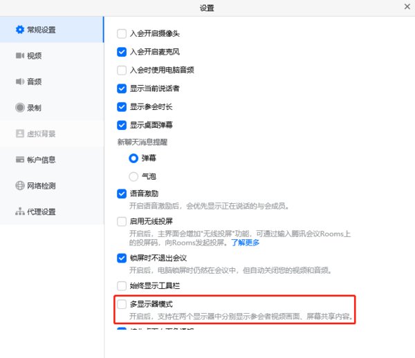 我们先看看Windows端的双屏模式打开流程。首先打开腾讯会议,点击界面右上方齿轮图标,打开设置界面。在设置界面上,我们选择左侧的“常规设置”一栏,在常规设置界面里可以看到有一个选项叫“多屏幕模式”,我们将这个选项勾选,就代表着已经开启腾讯视频的双屏模式了。