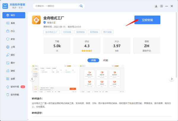 方法三:天极软件管家下载,在天极软件管家中,我们依然可以找到金舟格式工厂的下载资源;在此,我们只需搜索到金舟格式工厂,即可开始下载,也是非常方便。