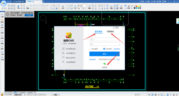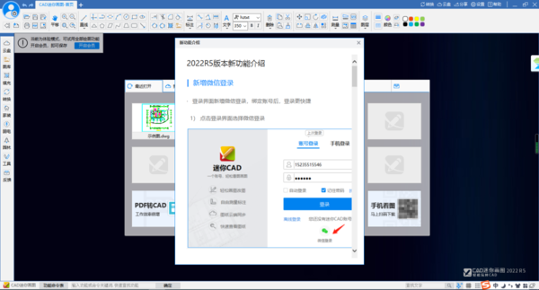 根据财神爷站小编的亲自使用以及查找各种资料内容来看,CAD迷你画图软件目前的登录方式一共有三种,首先是账号密码的登录方式,其次是手机号码的登录方式,最后就是微信的登录方式了。而其中手机号码登录是在2022R4版本的CAD迷你画图中新增加的功能,微信登录则是在2022R5最新版本CAD迷你画图中新增加的功能,有了手机号码和微信登录的方式,日常办公就会变得更加顺利高效。
