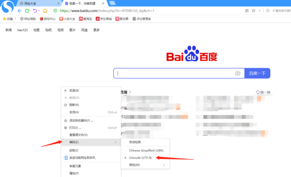 3、调整页面编码。只需我们在搜狗浏览器任意界面,右键单击空白处,点【编码】,接着点【UTF-8】,亦可解决部分浏览器显示异常问题。
