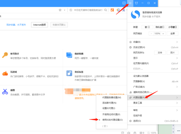 5、使用代理。依然点击【三道杠】,再点击【代理设置】,之后我们点【使用IE代理设置】,也可以帮助我们解决部分搜狗浏览器页面异常问题。