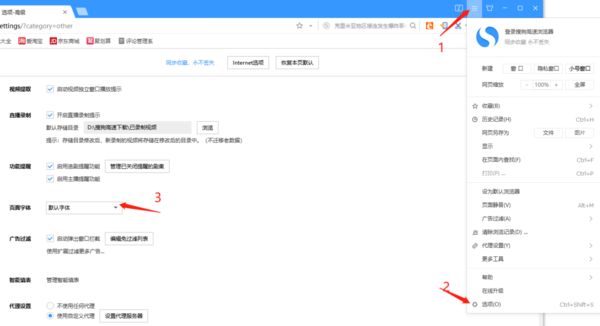 2、调整默认字体。我们点击搜狗浏览器UI右上方【三道杠】图标,接着点击【选项】;跳转到选项页后,再点击左侧【高级】,之后我们会在中间看到【字体】,将其调整为默认字体,或许可以解决搜狗浏览器的页面异常等问题。