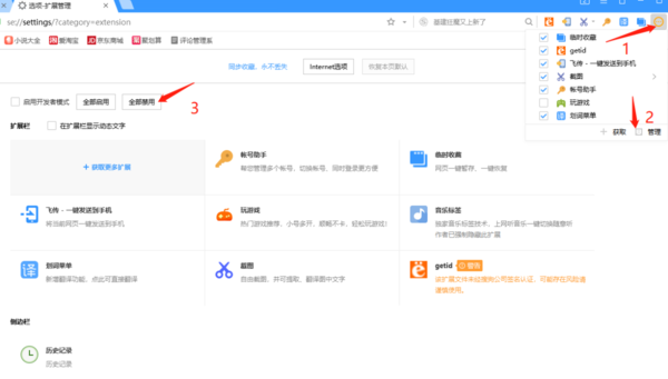 1、禁用插件。我们在搜狗浏览器主界面,点击UI右上角的扩展功能按钮,接着点击【管理】,进入插件管理界面;之后我们点击【全部禁用】以禁用搜狗浏览器全部插件,说不定搜狗浏览器页面会从异常中恢复。