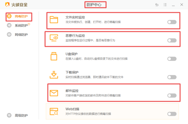 在火绒安全软件的主界面中,点击选择【防护中心】选项,然后在【病毒防护】选项中,我们便可以看到【邮件监控】功能,点击该功能右侧的功能开关,开关变成橘色就代表功能成功的开启了。