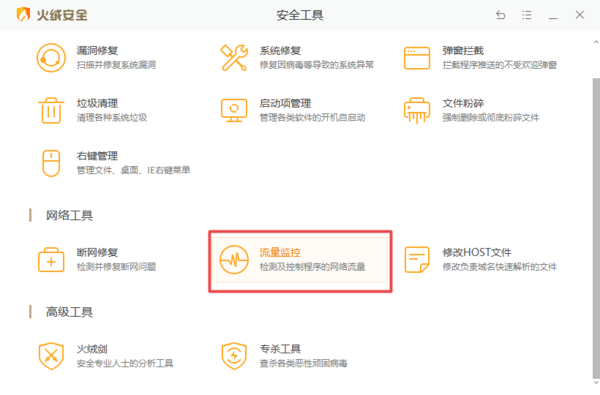 想要使用火绒安全软件来对电脑中的流量进行监控的话,那么此时我们需要打开电脑上的火绒软件,然后在主界面点击【安全工具】选项。