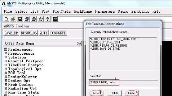 4.然后在界面上会出现一个窗口,我们在窗口下方的文本框中输入“*ABBR,UNDO,undo”,再依次点击“Accept”、“Close”按钮(如图所示)。