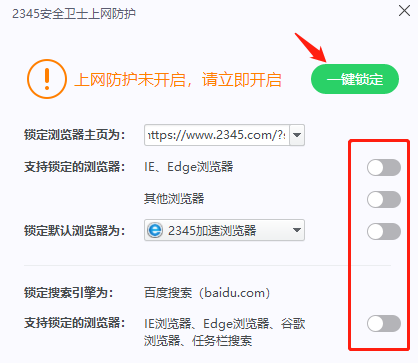 一、如果我们想同时对搜索引擎、主页进行保护,那可以直接点击【一键锁定】即可全面防护;