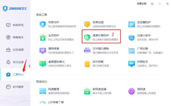 当我们打开2345安全卫士之后,点击左侧模块栏的【工具中心】,在【系统工具】中即可找到搜索引擎防护;我们点击该按钮即可进入2345安全卫士搜索引擎防护界面。