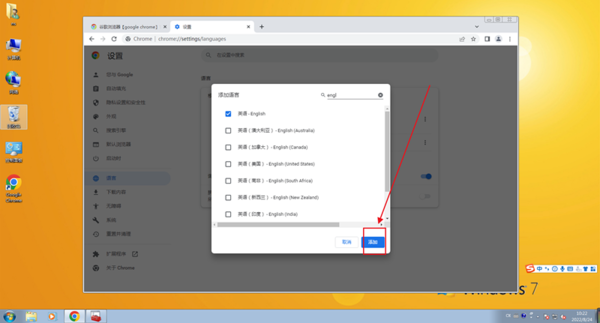 3、在语言设置页面找到“English”,勾选英语,点击右下角的“添加”,如下图所示。