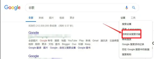 5、同时也可以在简体中文语言的设置下直接进入到搜索页面,找到搜索页面里的设置,然后就会有一个下拉框,将其中的“关闭安全搜索”选择上就可以了。
