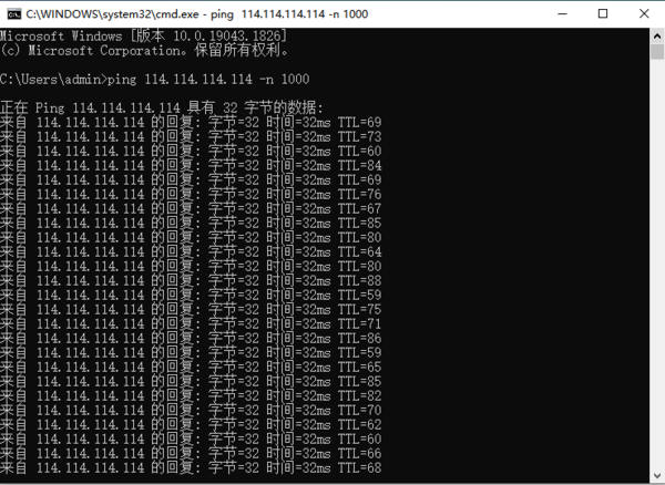 2、然后根据下图所示在命令提示符的输入窗口中,依次输入ping?114.114.114.114?-n?1000?后点击?Enter键。