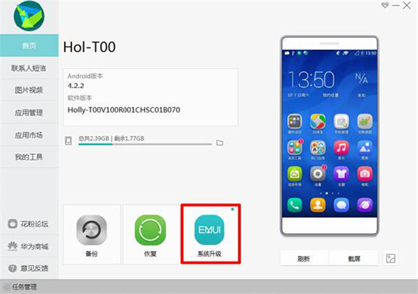 第二步,此时找到电脑上华为手机助手主界面下方的“系统升级”选项,然后点击进入。