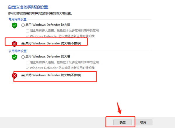 6、最后一步,我们需要把防火墙中的“专用网络设置”和“公用网络设置”下的“启用Windows?Dedender防火墙”改为“关闭Windows?Dedender防火墙”即可,如下图红色方框所示,勾选上红色方框的内容,最后点击右下角的“确定”,这样就设置完成了。