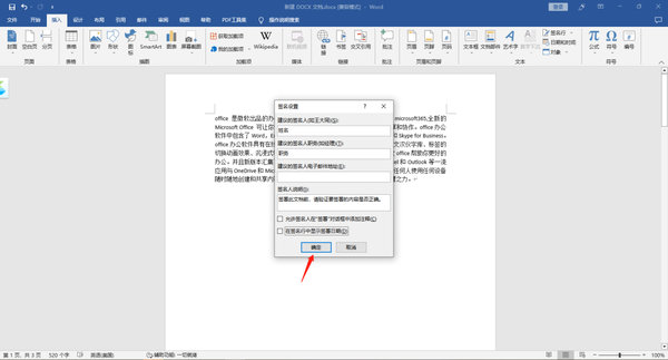 2、打开【签名设置】对话框,在对应的文本框中输入建议的签名人姓名、职务、电子邮件地址以及向签署入提供的说明;如果不需要显示签署的日期,则取消勾选择【在签名行中显示签署日期】,填写完毕,单击【确定】按钮。