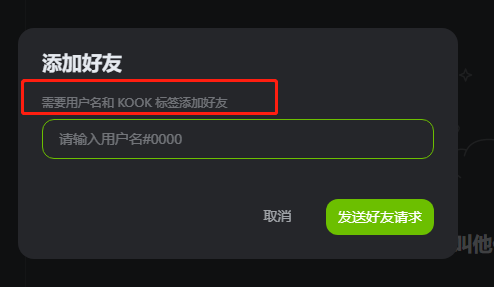 3、随后会弹出一个添加好友的窗口,在这里添加好友需要用户名和KOOK标签,输入后点击【发送好友请求】即可;