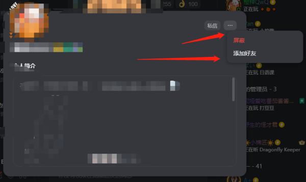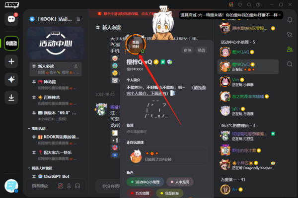 1、进入服务器,找到想要添加好友的用户,点击用户头像,可以看到用户的资料卡;