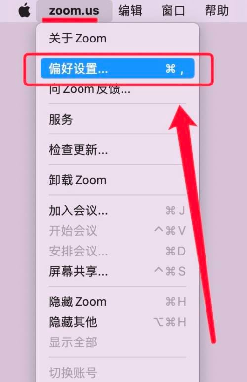 2,在软件的上方找到并点击【zoom.us】,在弹出的菜单下拉框中点击第二个【偏好设置...】。