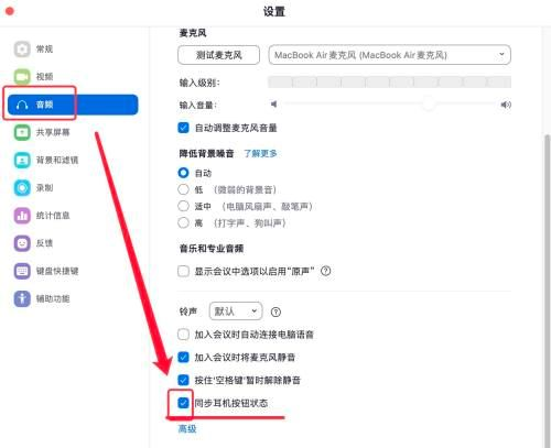 3,然后就进入到了设置页面,在左侧的功能栏中选择第三个“音频”选项,然后目光移到右侧的设置页面中,找到“同步耳机按钮状态”,将前面的小方框勾选上对勾,代表成功设置了。