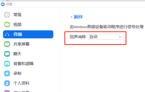 4、进入到“音频”的设置页面以后,在右侧可以看到有一个“回声消除”并可以选择下拉框的区域,我们将下拉框里的功能选择为“自动”,这样就能够在开会的时候,软件自动消除出现的回声效果了,可以更好的提高我们开会时的声音听取效果,防止受到回声效果的打扰。
