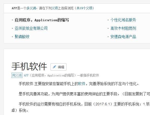 在百度里面搜索“APP”,打开百度百科的链接,我们会发现打开的其实是“手机软件”的条目,“APP”和“手机软件”是同义词,而APP就是英文单词application的缩写,翻译成中文就是“应用”,一般就是指手机应用,当然平板和TV上也是这个称呼的。