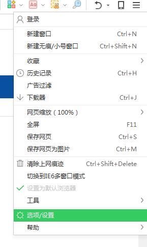 首先点击浏览器右上角的菜单选项,在下拉菜单里选择【选项/设置】;