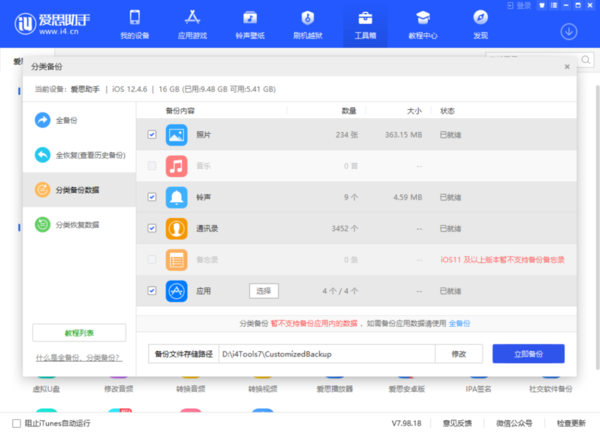 第四步,而如果你想要对数据进行分类备份的话,点击选择【分类备份数据】选项,然后在右侧的界面中,根据实际需求来进行数据类别的选择,比如照片、铃声、通讯录、应用等选项。